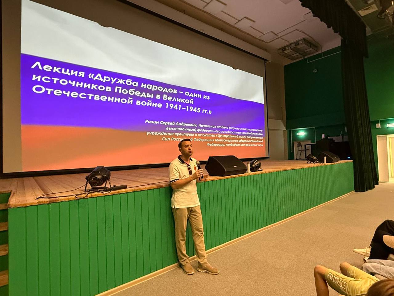 На днях начальник научно-экспозиционного и выставочного отдела ЦМВС РФ Сергей Андреевич Разин прочитал лекцию на тему «Дружба народов как важный фактор победы в Великой Отечественной войне». На занятии были учащиеся летних лагерей 4-х школ, студенты и преподаватели Арктического государственного института культуры и искусства. Сергей Андреевич также ответил на вопросы слушателей и провел научно-методическое занятие по созданию и улучшению экспозиций местных музеев.