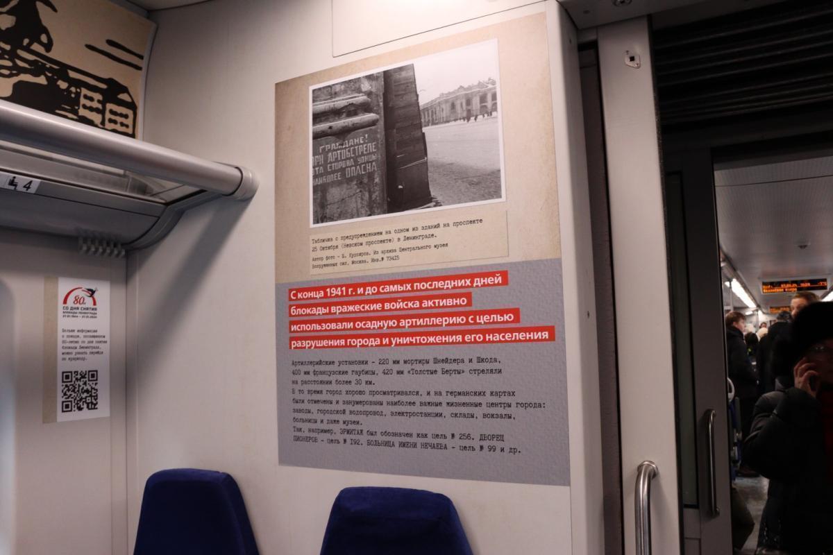 Каждый из пяти вагонов «Ласточки» посвящен отдельной теме из жизни ленинградцев в годы блокады: быту, медицине, искусству и другим. Благодаря архивным фотографиям и ценной информации, предоставленной ЦМВС РФ и другими музеями, пассажиры состава смогут больше узнать о подвиге непокоренного Ленинграда.
