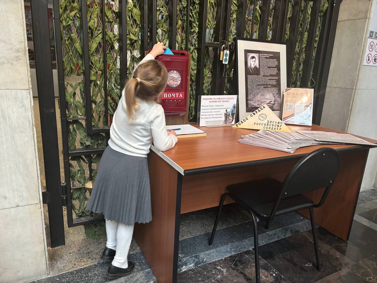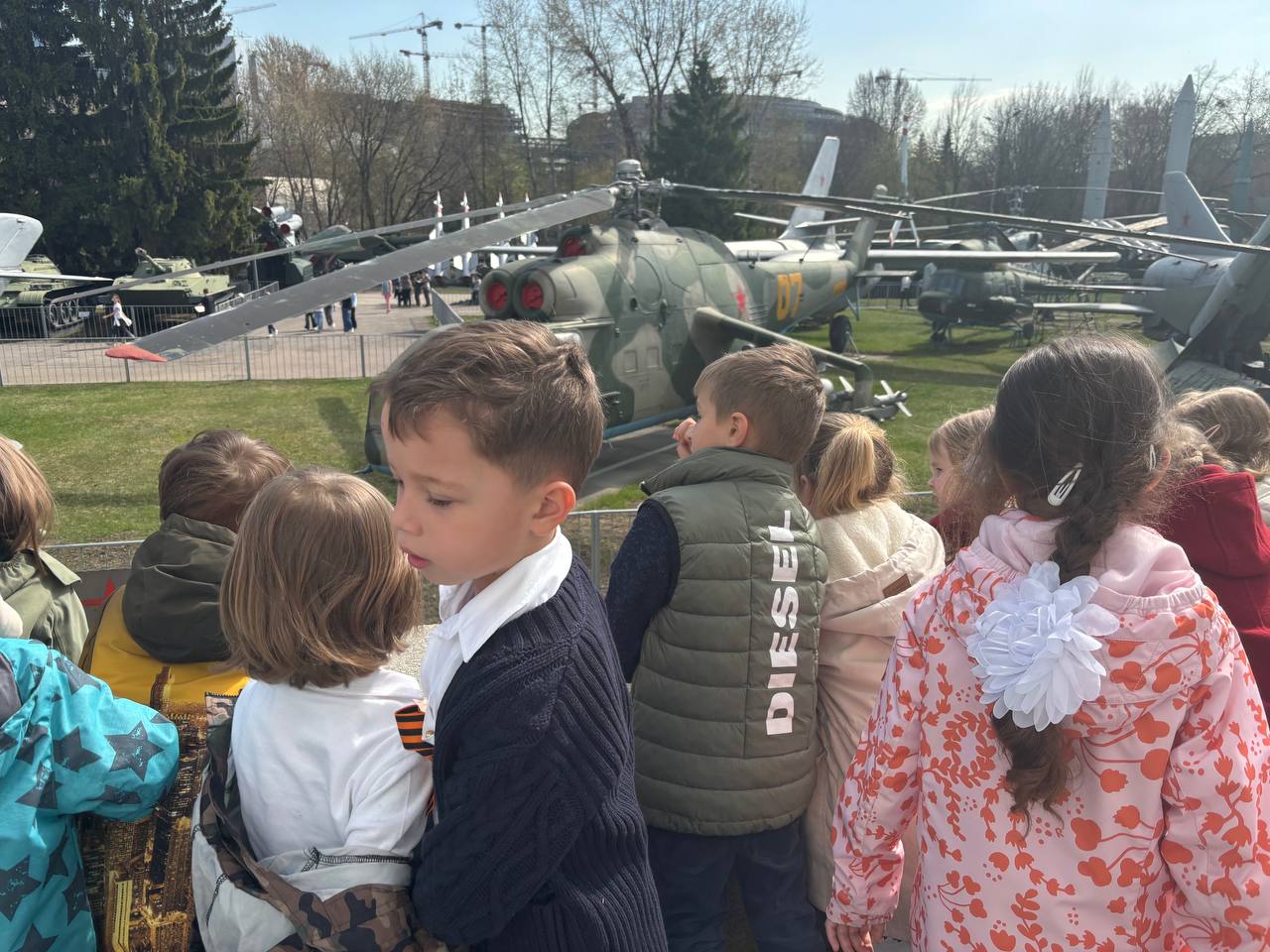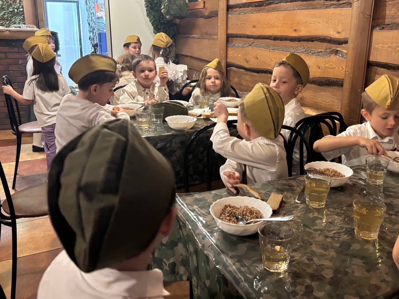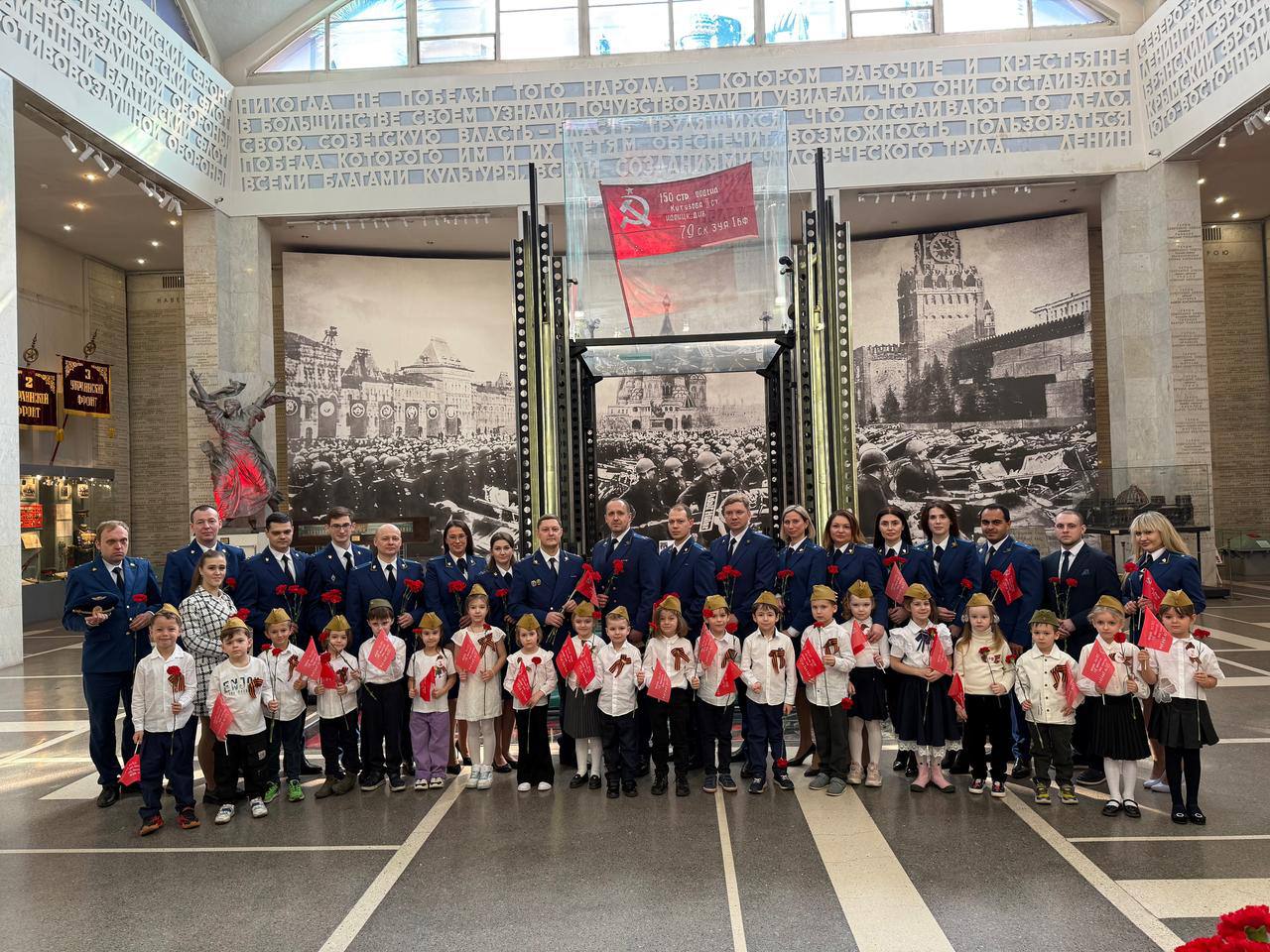 После экскурсии дети вручили красные гвоздики представителям прокуратуры Московской области и сделали с ними памятное фото. Затем ребят ждал завтрак в виде солдатской каши в нашем кафе на первом этаже и небольшая прогулка по открытой площадке военной техники. В конце первого знакомства с музеем юные гости написали письма солдатам на передовую и по очереди опустили их в почтовый ящик.