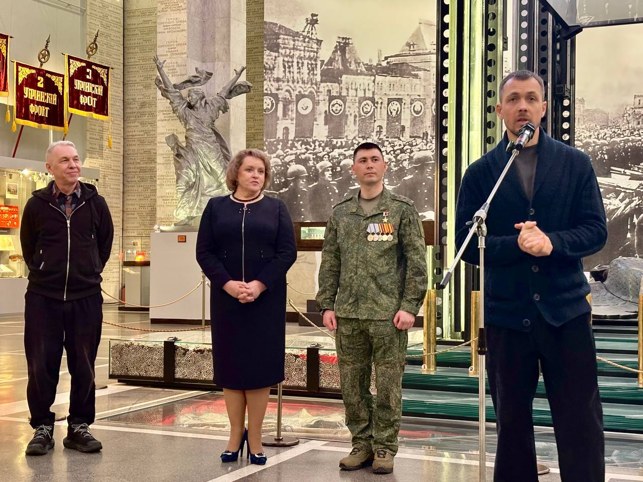 Перед гостями мероприятия выступили заместитель директора Центрального музея Вооруженных Сил Российской Федерации Евгения Анатольевна Гладких и Герой Российской Федерации, участник СВО, капитан Рустам Анатольевич Хасанов.