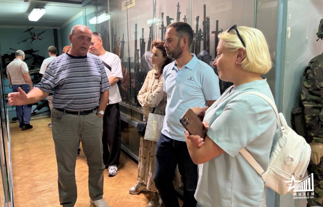 Посетители воочию увидели и узнали исторические факты о различных артефактах — Боевых знаменах, документах, наградах. На фото — момент посещения группой фонда вооружения и техники. Сергей Евгеньевич Плотников, старший научный сотрудник музея, рассказал об уникальных образцах холодного и стрелкового оружия XX века.