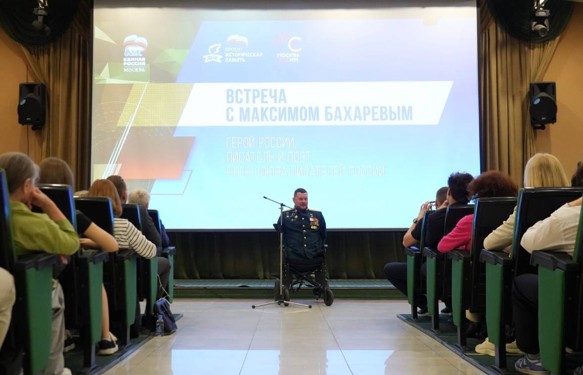 Встреча актива партии «Единая Россия» и молодежи Москвы с Героем России, ветераном СВО, членом Союза писателей России Максимом Бахаревым прошла в рамках федерального партийного проекта «Историческая память» и была посвящена Дню русского языка. Во время встречи Максим Бахарев поделился своими воспоминаниями о службе в зоне специальной военной операции и рассказал о своей писательской деятельности.