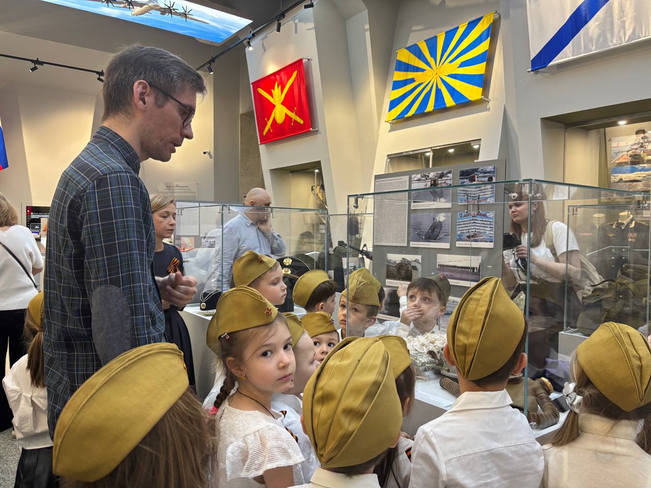 На днях к нам пришли воспитанники детского сада школы №1529 им. А. С. Грибоедова (старший методист Л. Ф. Мансарлийская). Научный сотрудник музея Данил Горобец показал и рассказал им об экспозиции залов №22-23, представил некоторые экспонаты выставки «Святое дело — Родине служить» и знаменитое Знамя Победы.