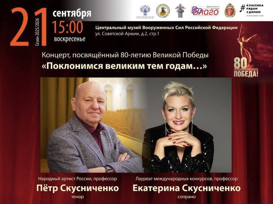 Мероприятие состоится в нашем музее 21 сентября, в воскресенье, в 15:00. Перед вами выступят народный артист России, профессор Пётр Скусниченко (тенор), лауреат международных конкурсов, профессор Екатерина Скусниченко (сопрано), а также студенты и ассистенты-стажёры Московской консерватории им. П. И. Чайковского и лауреаты международных конкурсов Вероника Ан, Тамара Еприкян, Алина Смирнова (партия фортепиано). Вы услышите песни И. Дунаевского, А. Новикова, В. Соловьёва-Седого, М. Фрадкина, М. Блантера, Я. Френкеля, отрывки из оперы К. Молчанова «Зори здесь тихие» и др. Больше деталей смотрите по ссылке ниже.