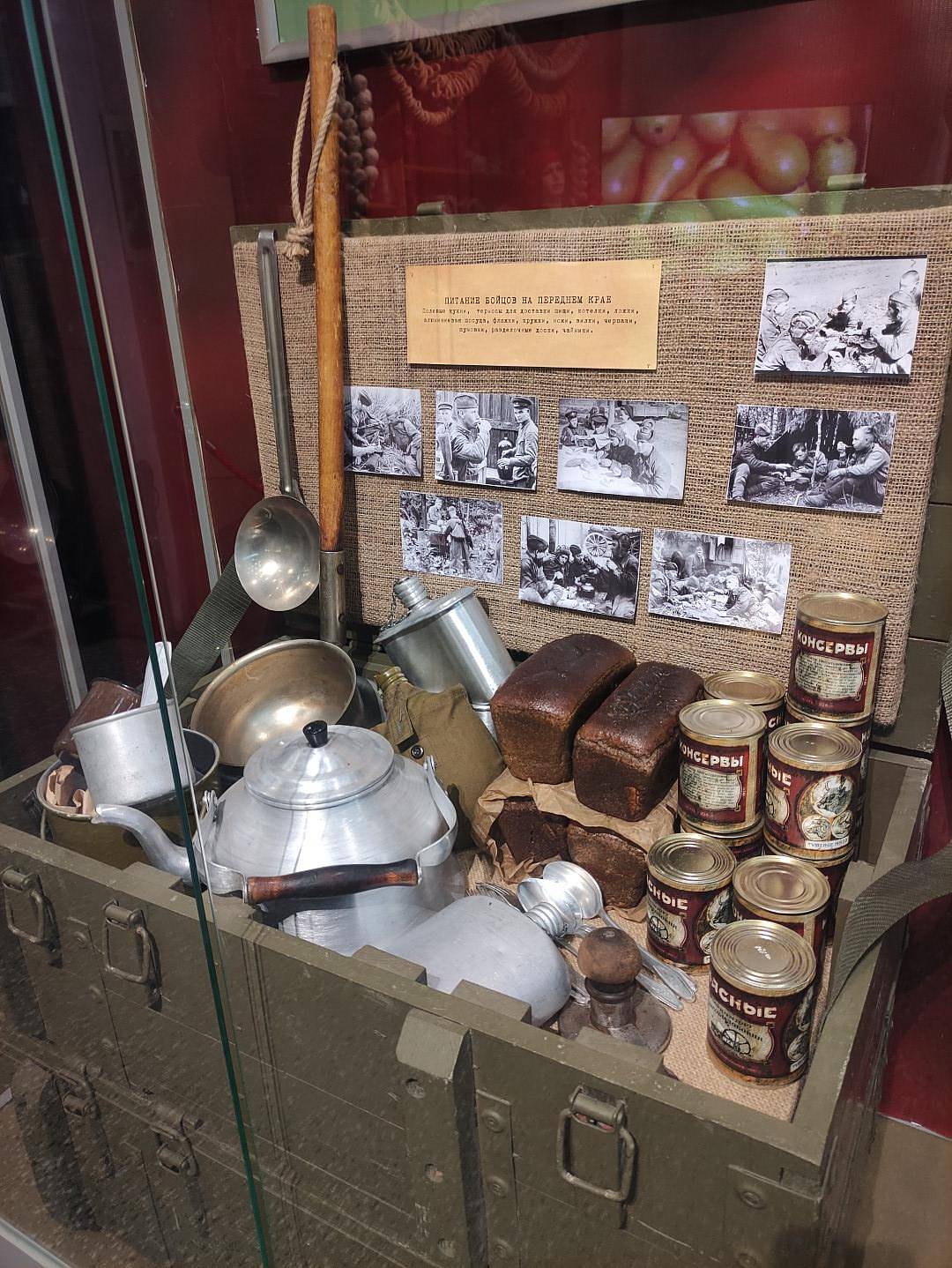 Особенность выставки – в представленном материале и его подаче. Большая часть собрания – обыденные вещи в исторической ретроспективе: старая посуда, табак «Киръ-Басма», консервы мясохладобойни Наркомторга, счёты, железные утюги... При этом, вокруг минимум этикетажа (основная информация на баннерах под потолком) и иногда кажется: вокруг не музейные витрины, а вещи деда или прадеда, брошенные в офицерский чемодан, привезенные во фронтовом ящике, разложенные на столе кабинета… Вот он – быт эпохи на расстоянии вытянутой руки.